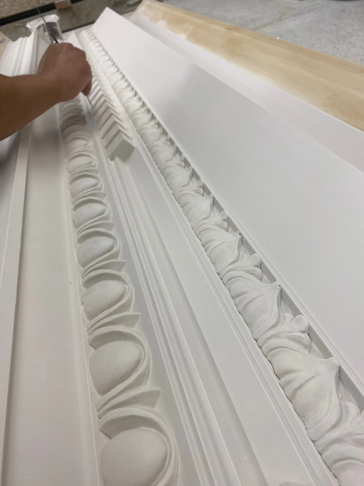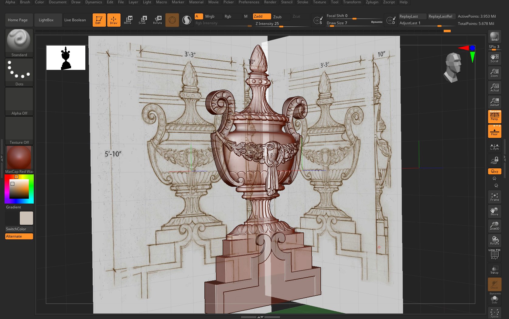 A Zbrush screenshot recreates an urn that will adorn a theatre’s proscenium arch. This will be uploaded to the client for approval before any hands-on work commences.
