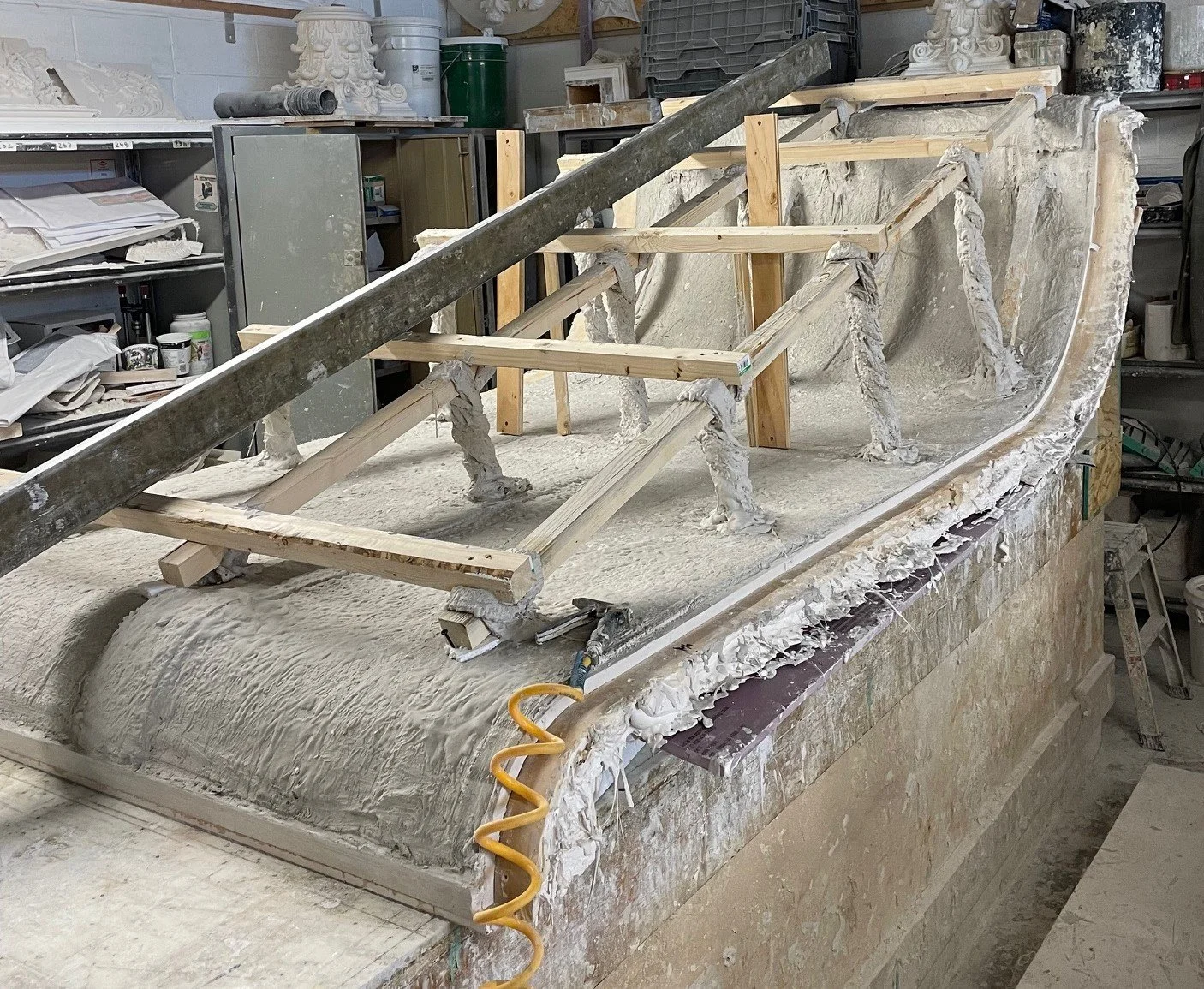This mold to one of our latest projects is almost ready to be removed and cast. Its profile spans more than 8 feet, demonstrating the size of casts that can be achieved.