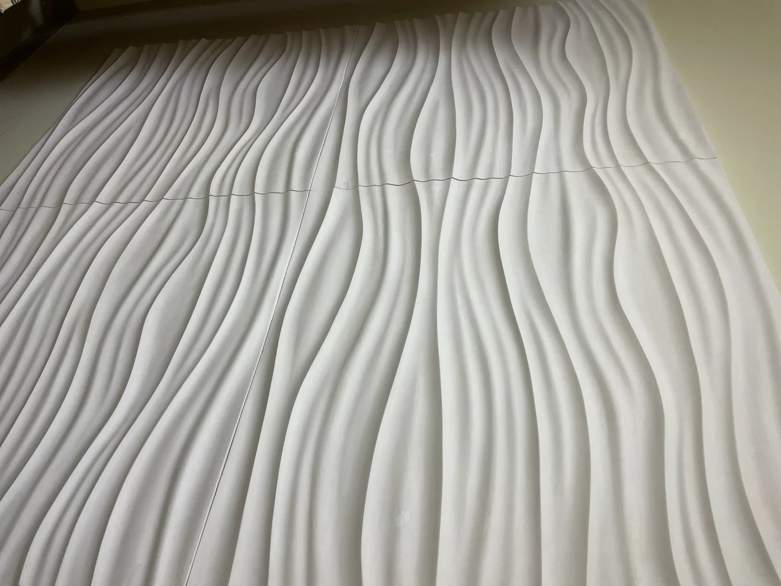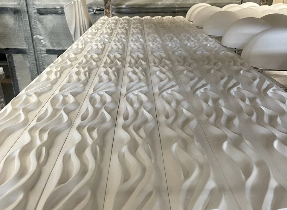 These liquid-like panels will not only make our client's walls full of light, shadow, and contour, their glass-fiber reinforced gypsum (aka "boring" plaster) is a lighter and more durable derivative of the classic décor material.