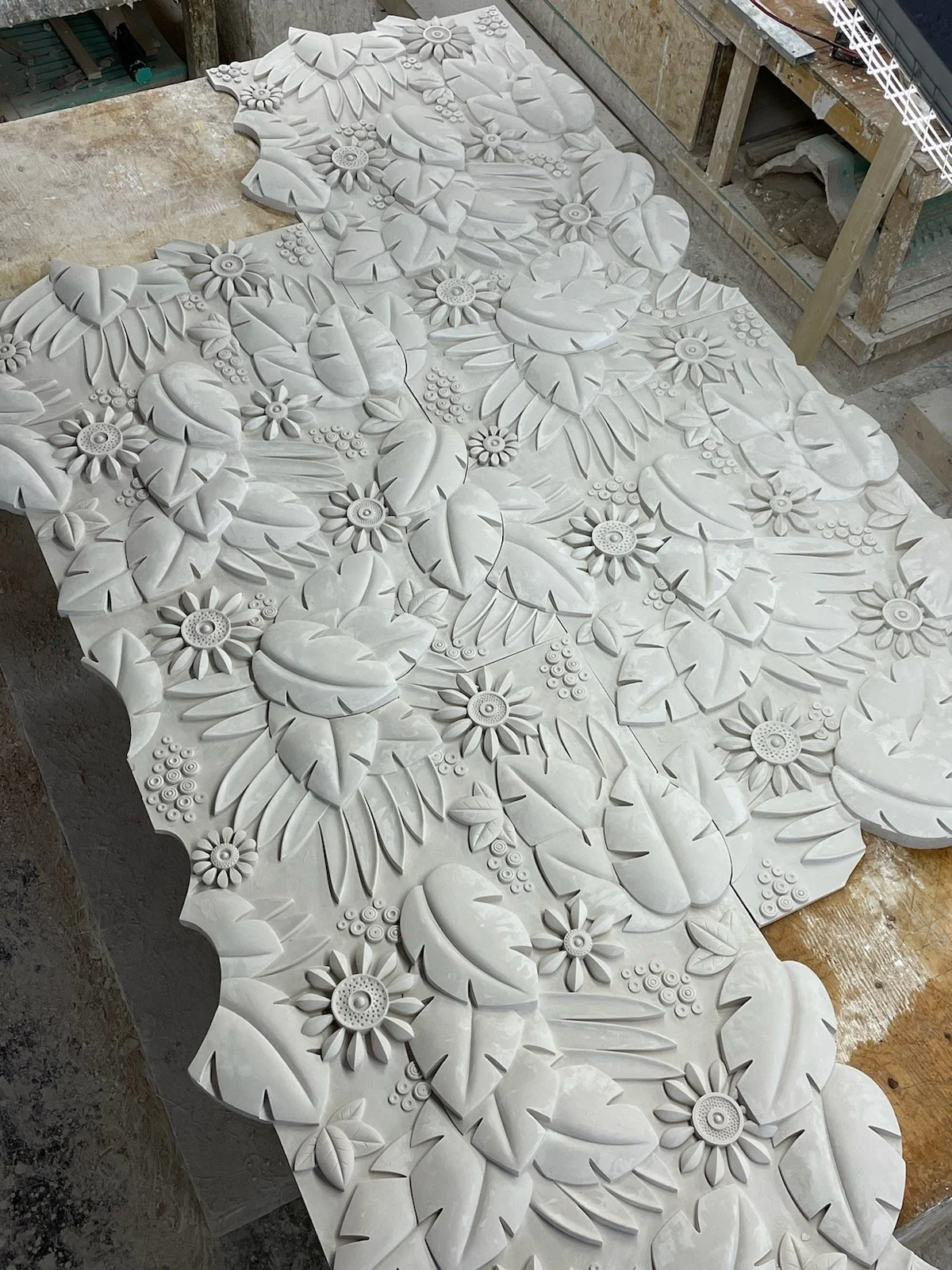 With this frieze pattern for Cartier assembled and approved, we’ll mould it and cast enough copies for the complete 10’ by 24’ piece. Can you see how they’ll fit together? Installation will be a lot safer and easier thanks to the GFRG’s lighter weight.