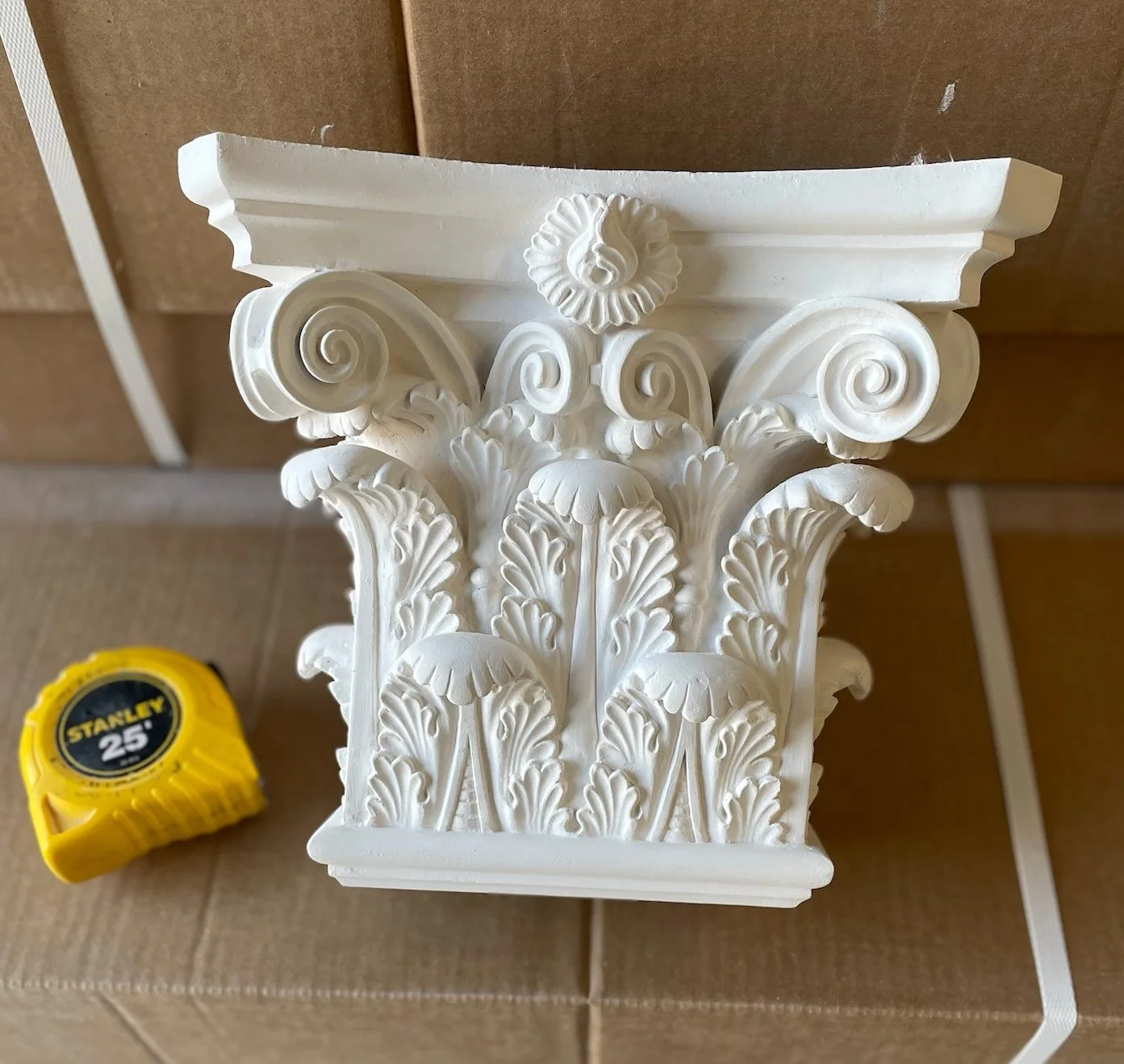 This highly detailed piece is a Corinthian capital. These capitals can be identified by their diminished volutes and extravagant amounts of acanthus leaves. Palladio GFRG capitals are renowned for their sculptural beauty as well as their historical accuracy. This one will soon be adorning our client's abode in Montreal.