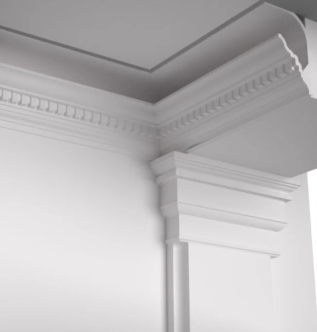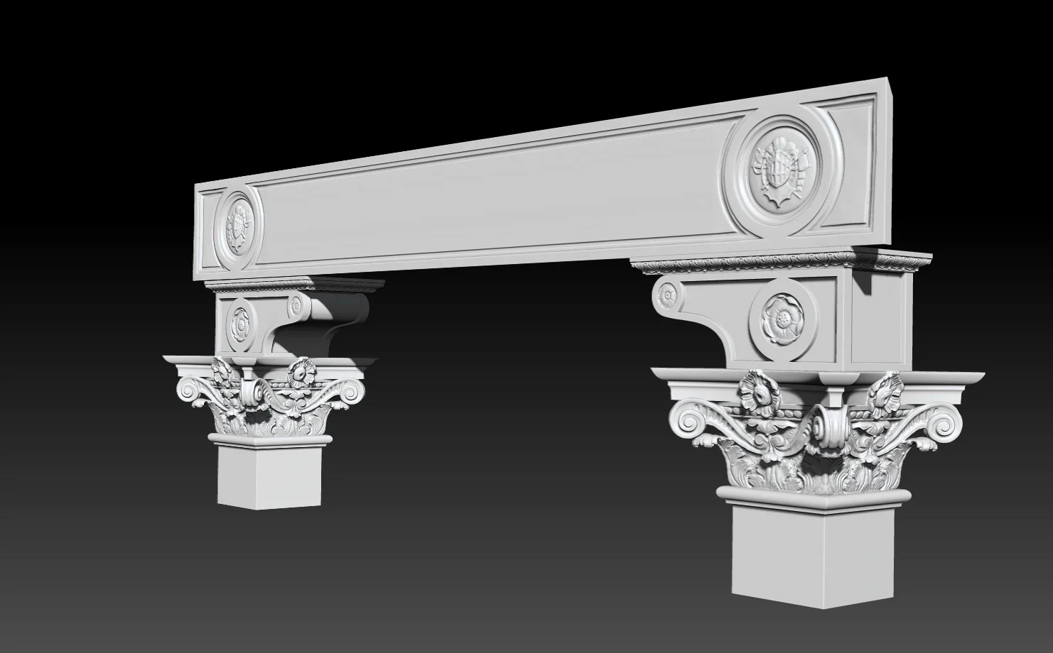 Digital mock-ups, like this custom-drawn 3D model of a capital, bracket, and lintel surround, allow rapid prototyping, iterations, and client approval without wasting actual materials and worker hours.