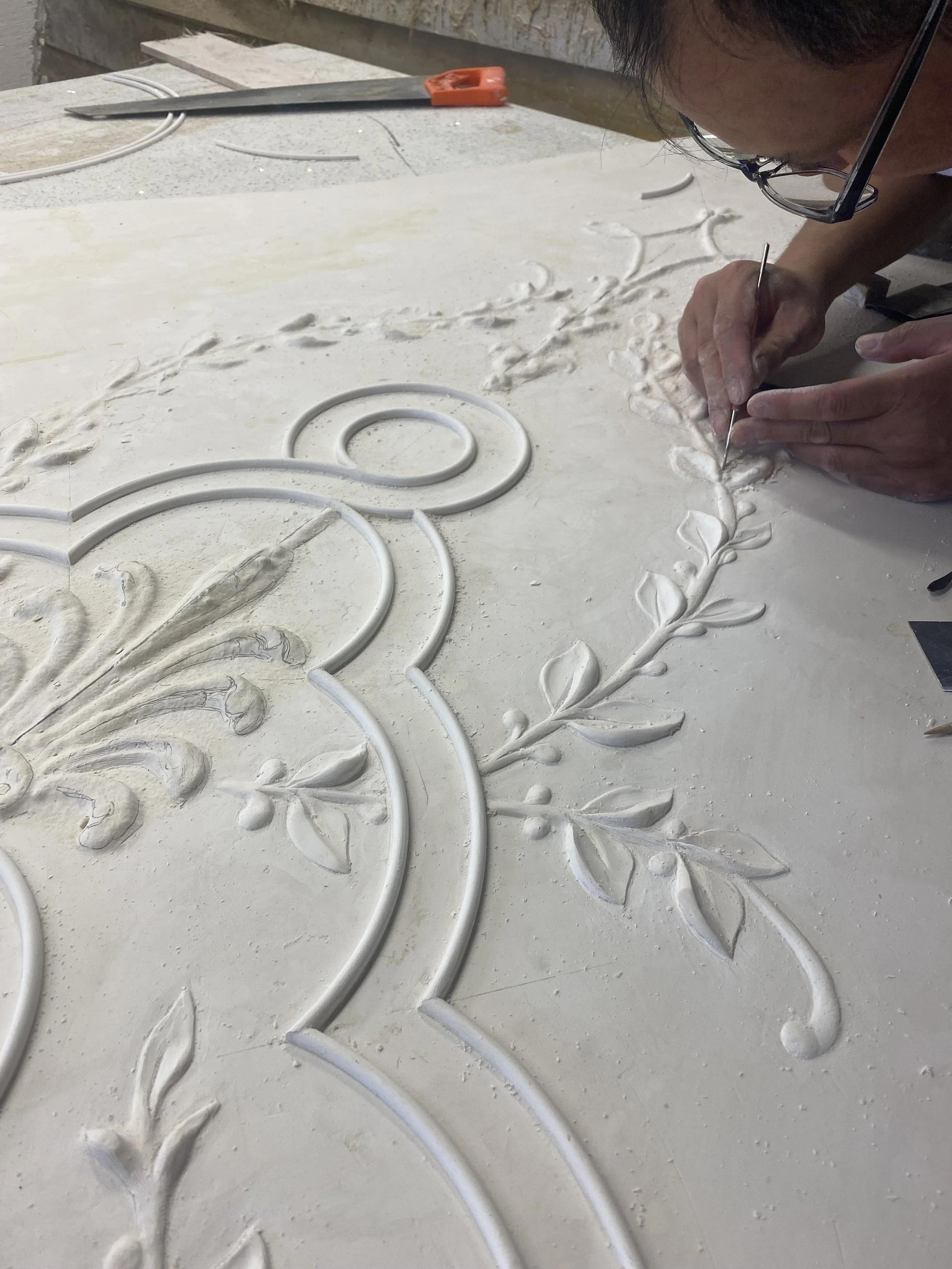Unlike human faces, the lines and details of aging plaster pieces fade over time. This medallion gets a reverse face-lift as we carve details back into it.