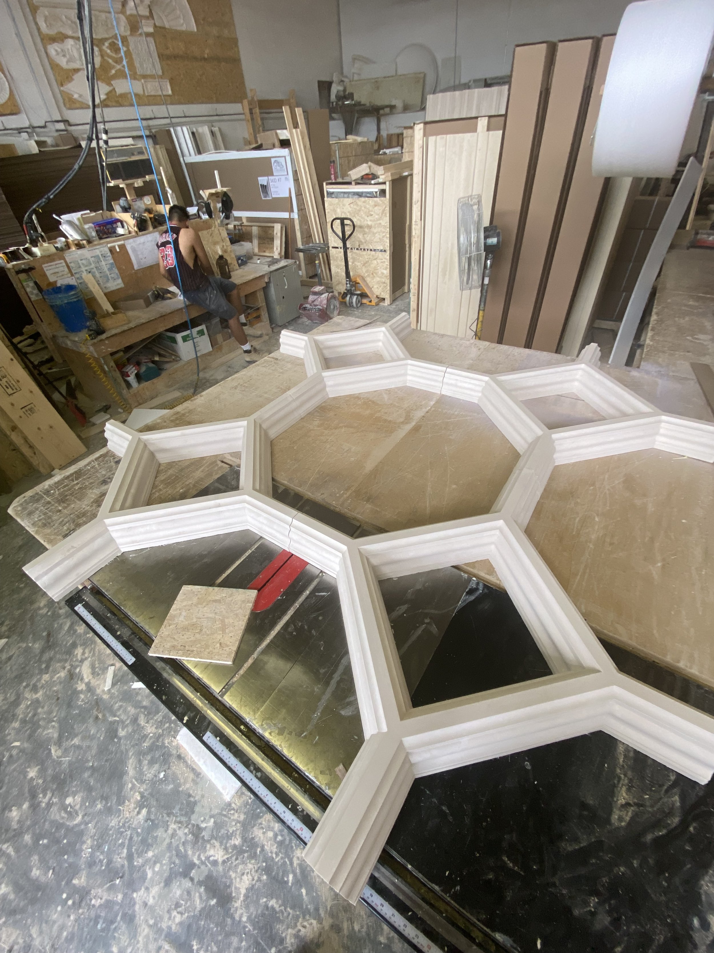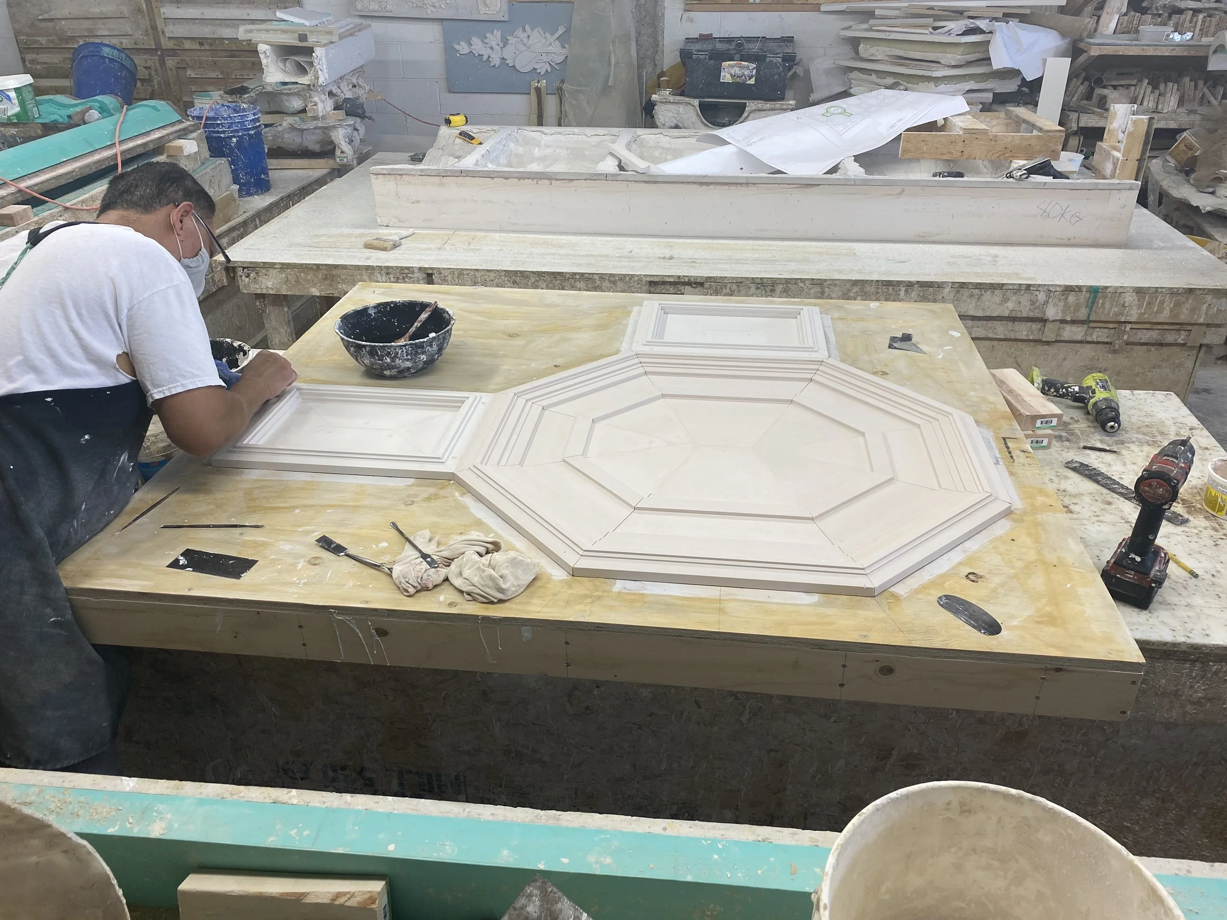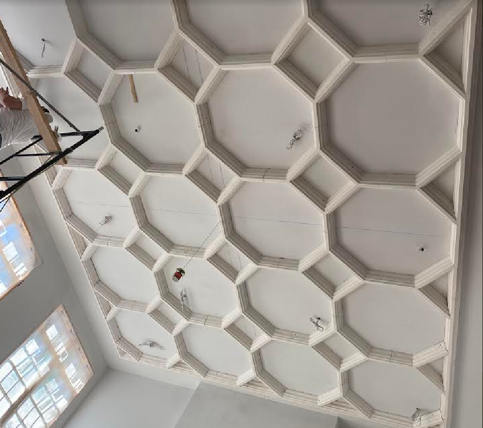 This shallow relief ceiling system is an excellent example of how to use simple cast pieces over and over to create a larger, more complicated work.